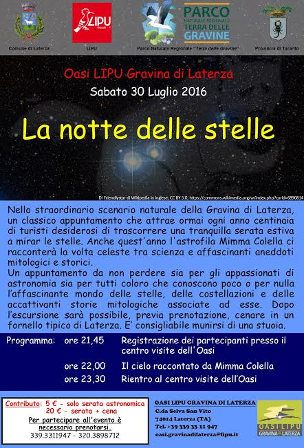 Nell’ambito del programma Eventi-Natura 2016 dell’Oasi LIPU Gravina di Laterza, realizzato grazie al contributo della Provincia di Taranto e del Comune di Laterza, sabato 30 luglio p.v., alle ore 21.45, si terrà l’evento denominato La notte delle stelle.