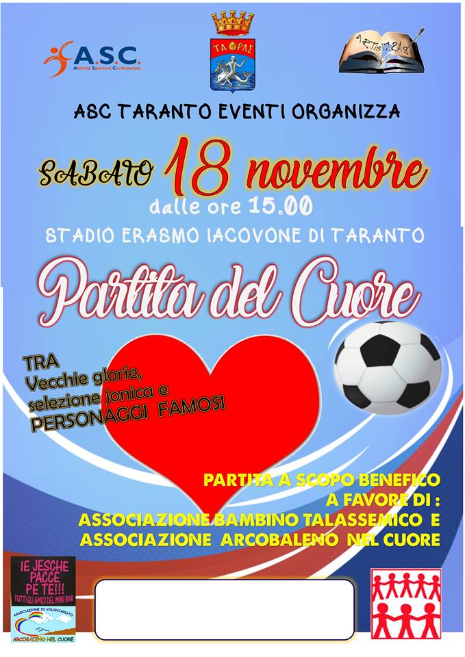 Sarà disputata sabato 18 novembre p.v. alle 15:00 presso lo Stadio Jacovone di Taranto la Partita del Cuore tra le vecchie glorie della selezione jonica e personaggi famosi.