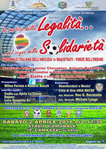 Nell’incontro si affronteranno una squadra composta da magistrati – forze dell’ordine e la squadra della Nazionale Italiana Dell’Amicizia, composta da campioni del calcio italiano, come Pierluigi Orlandini, Pasquale Bruno, Javier Chevanton, Antonio Benarrivo, Guillermo Giovanazzi.