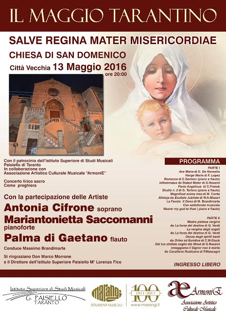 Venerdì 13 maggio, alle ore 20:00, presso la Chiesa di San Domenico in via Duomo nel cuore della Città Vecchia di Taranto, la splendida voce del Soprano – Antonia Cifrone, accompagnata da Palma di Gaetano – Flauto e Mariantonietta Saccomanni – Pianoforte, darà espressione e suono alle più belle preghiere tratte dal repertorio sacro e operistico di compositori italiani e non.