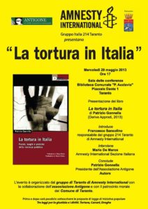 Il Gruppo 214 Taranto di Amnesty International organizza per il 29 maggio alle ore 17:00 presso la Biblioteca “Pietro Acclavio” un incontro-dibattito sul tema della Tortura.