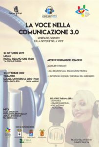 Nell’ambito della promozione del Centro regionale dell’audiolibro pugliese l’UICI Puglia, in collaborazione con le sezioni territoriali UICI Lecce – UICI Taranto e con la Dott.ssa Fabiana Sera, figura eclettica del comparto Spettacolo Nazionale (fondatrice di Parlarbene, speaker radiofonica nazionale, coach di dizione) organizza un workshop gratuito sulla gestione della voce nella comunicazione che si terrà giovedì 24 ottobre alle 17:00 presso l’Aula Magna della Università LUMSA in P.zza S. Rita a Taranto.