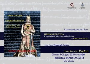 Questo pomeriggio, giovedì 6 giugno, alle ore 18,30 nella suggestiva cornice della Biblioteca Comunale “Marco Gatti” di Manduria, l’Archeoclub di Manduria organizza l’incontro con l’autore prof. Cristian Guzzo per la presentazione del libro dal titolo Federico II di Svevia – L’uomo oltre il mito, il mito oltre l’uomo.