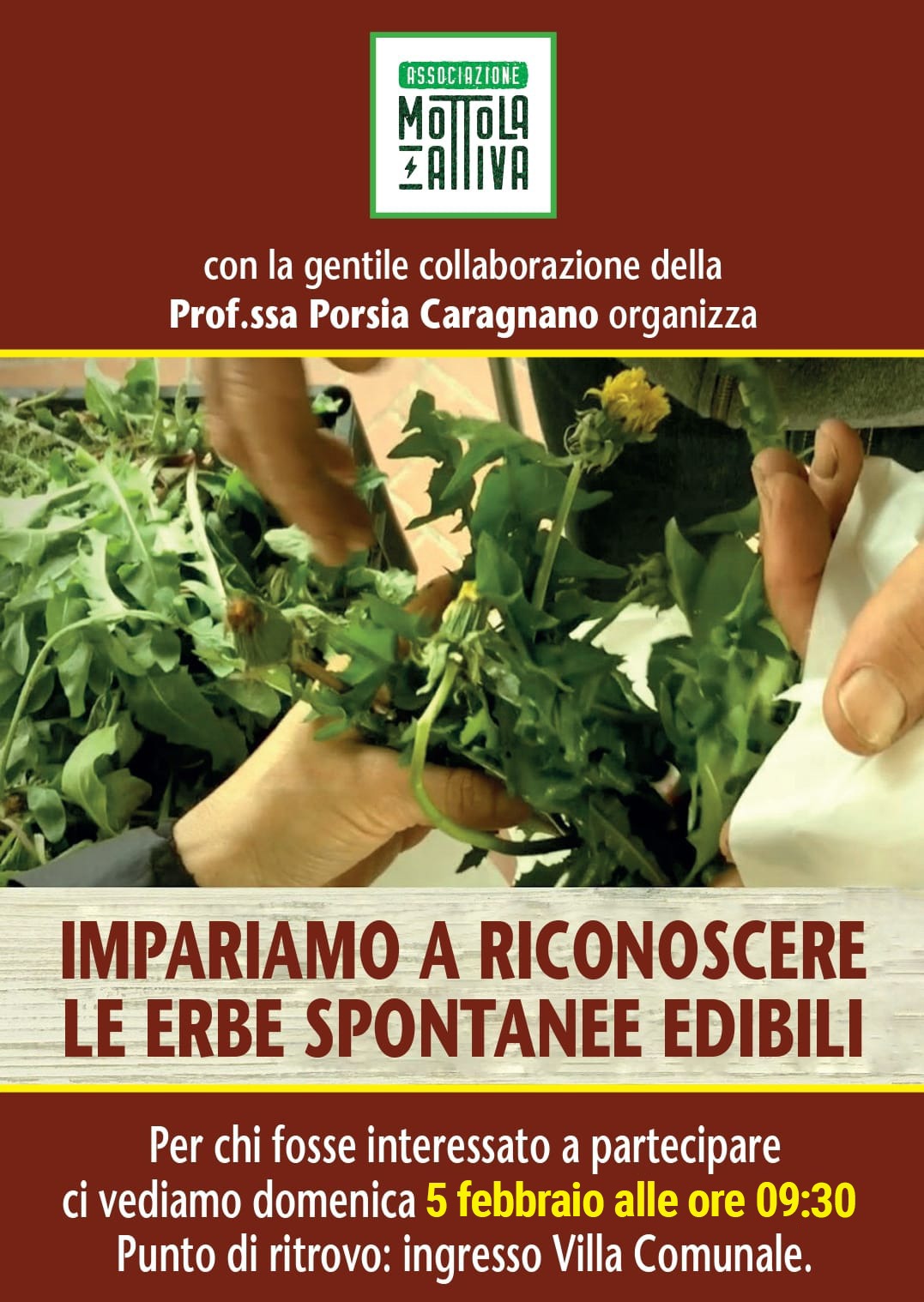 Come riconoscere le numerose erbe spontanee edibili presenti sul nostro territorio; sarà la Prof.ssa Porsia Caragnano a spiegarlo nel corso dell’iniziativa organizzata dalla ODV Mottola Attiva per la giornata di domenica 5 marzo presso l’Azienda agricola “Il Carrubo” di Mottola.