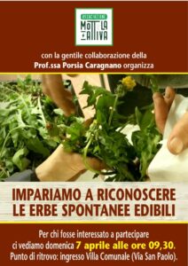 Come riconoscere le numerose erbe spontanee edibili presenti sul nostro territorio; sarà la Prof.ssa Porsia Caragnano a spiegarlo nel corso dell’iniziativa organizzata dalla Mottola Attiva ODV per la giornata di domenica 7 aprile, presso l’Azienda agricola “Il Carrubo” di Mottola.