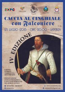 la IV edizione della Caccia al Cinghiale con falconiere – rievocazione storica ambientata nel XVI – XVII secolo che si svolgerà a Laterza sabato 25 luglio a partire dalle ore 19:00.