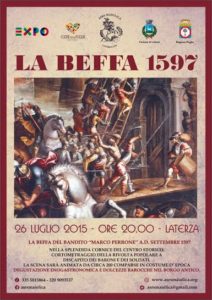 l’evento LA BEFFA 1597 – con cortometraggio che narra la rivolta del popolo laertino – previsto per domenica 26 luglio alle ore 20:00. Nel XVI secolo furono feudatari di Laterza la nobile famiglia napoletana D’Azzia. I feudatari erano utili al re, prestando appoggio militare e versando le tasse attraverso lo sfruttamento del popolo, sottoponendo quest’ultimo a sacrifici sovraumani. Il disagio materiale e morale fu fortemente avvertito dai laertini che furono indotti a proteggere i fuorilegge contro i funzionari del governo e gli amministratori dei baroni che premevano perché la nostra Università era insolvente. Un episodio di insurrezione popolare nel nostro paese, avvenne nel settembre del 1597. A Laterza era giunto il commissario baronale con soldati di scorta che arrestarono il bandito Marco Perrone. Quest’ultimo non solo agiva contro i banditi, ma venne a Laterza per esigere le rendite gravanti sull’Università indebitata. Complice del commissario era il feudatario D’Azzia, ma i cittadini, liberarono il bandito e rinchiusero nelle carceri baronali il commissario e i soldati di scorta.
