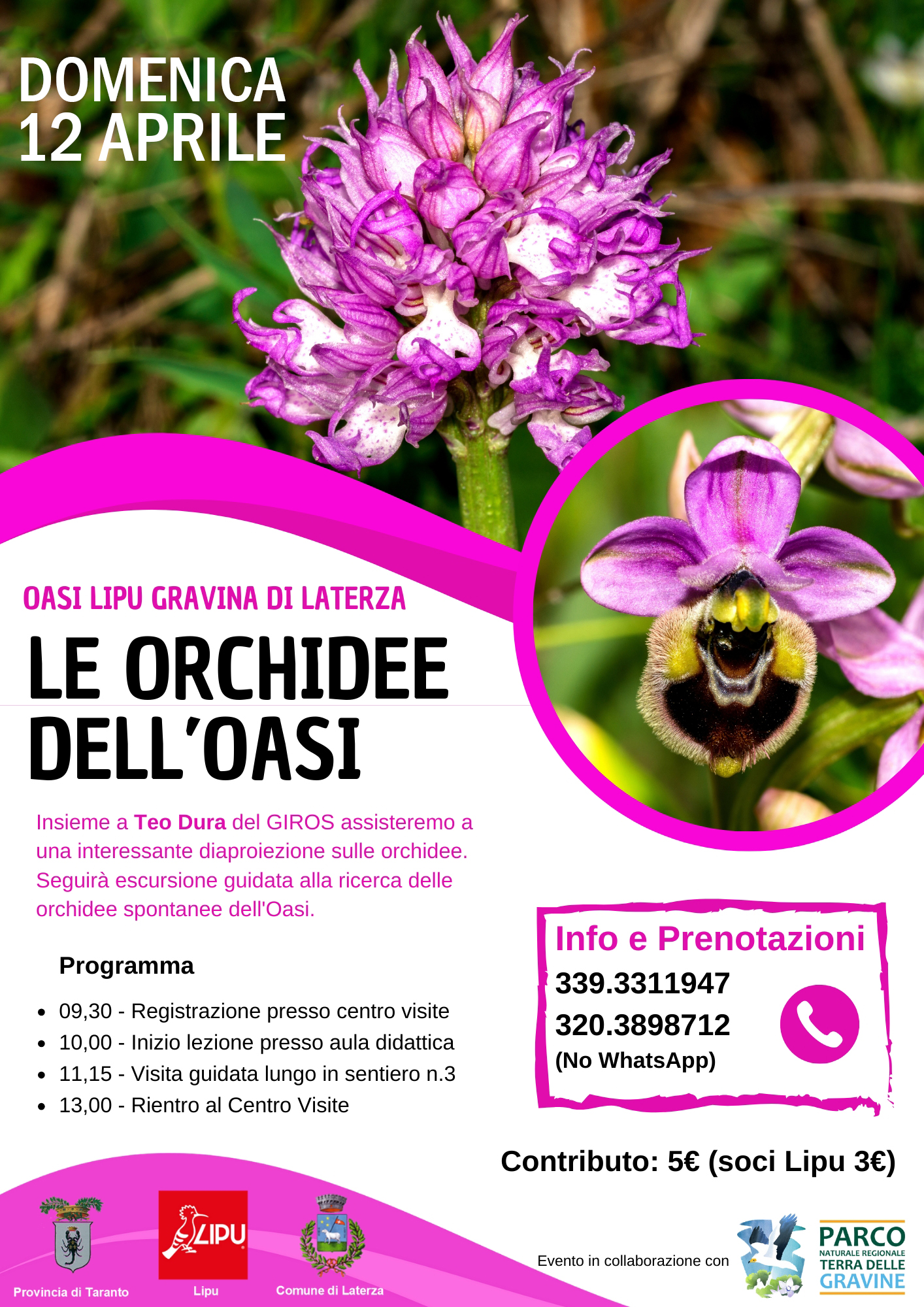 Nell’ambito del programma Eventi-Natura 2026 dell’Oasi Lipu Gravina di Laterza domenica 12 aprile, alle ore 09.30, si terrà l’evento Le orchidee dell’Oasi.