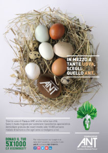 Fino a sabato 20 aprile, i Volontari ANT offriranno – a fronte di una donazione minima – uova di cioccolato e altri prodotti a tema nelle principali piazze d’Italia e in alcuni centri commerciali.