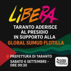 Sabato 6 settembre alle ore 09:30 Libera Taranto sarà davanti alla Prefettura insieme alla CGIL per sostenere la missione verso Gaza della Global Sumud Flotilla.