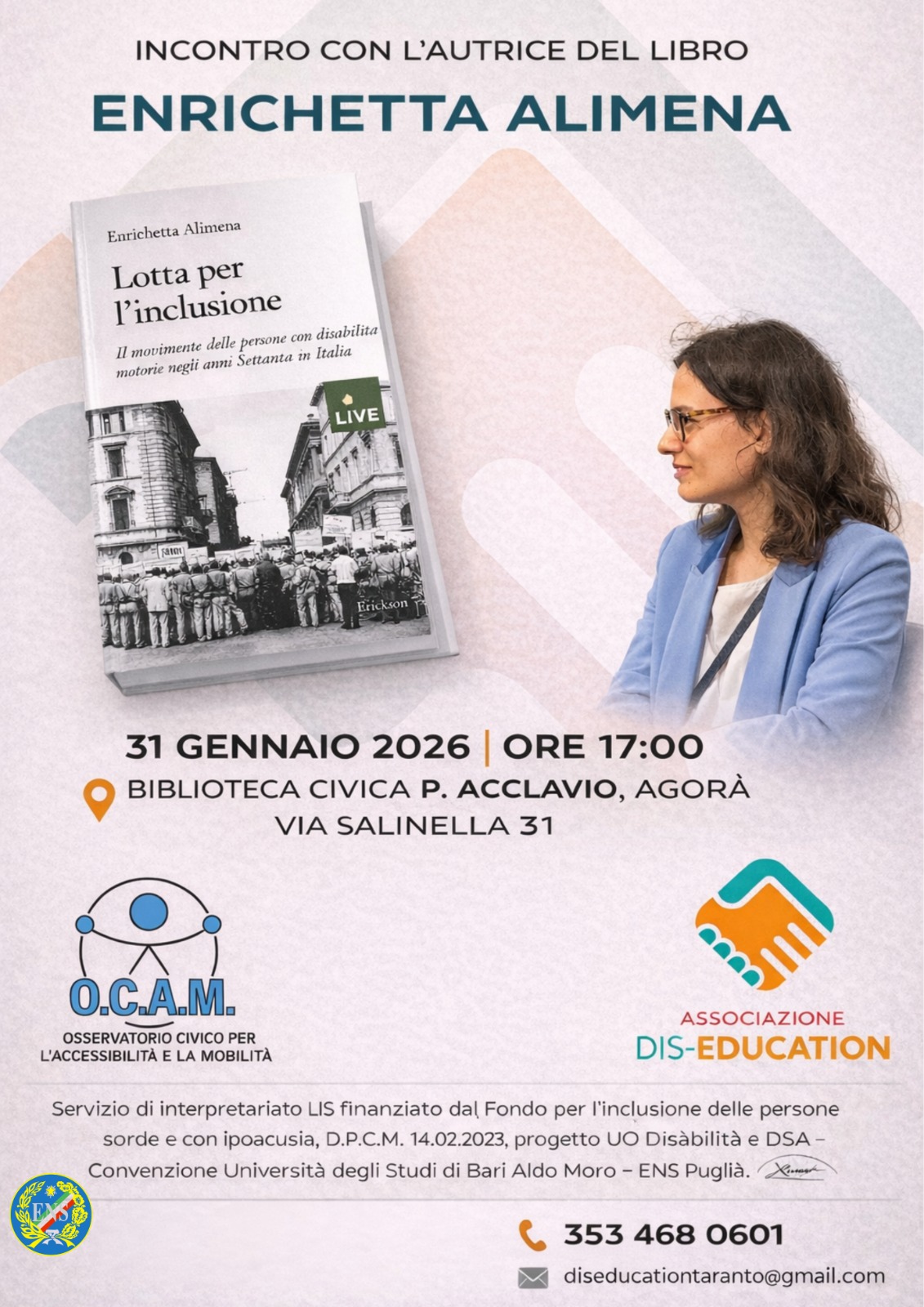 Dialogherà con l’autrice Alessandra Mastrorosa, interverrà Marco D’Andria, Presidente dell’Associazione Dis-Education APS ASD che promuove l’evento in collaborazione con O.C.A.M. – Osservatorio Civico per l’Accessibilità e la Mobilità.