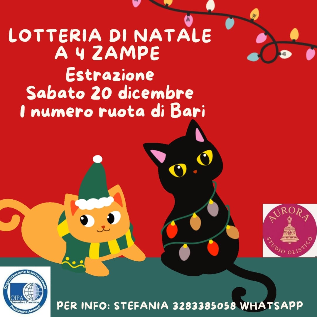 E’ organizzata da OIPA – Organizzazione Internazionale Protezione Animali sez di Taranto la lotteria benefica di natale finalizzata al sostentamento degli animali raccolti e assistiti dall’Organizzazione sul territorio.