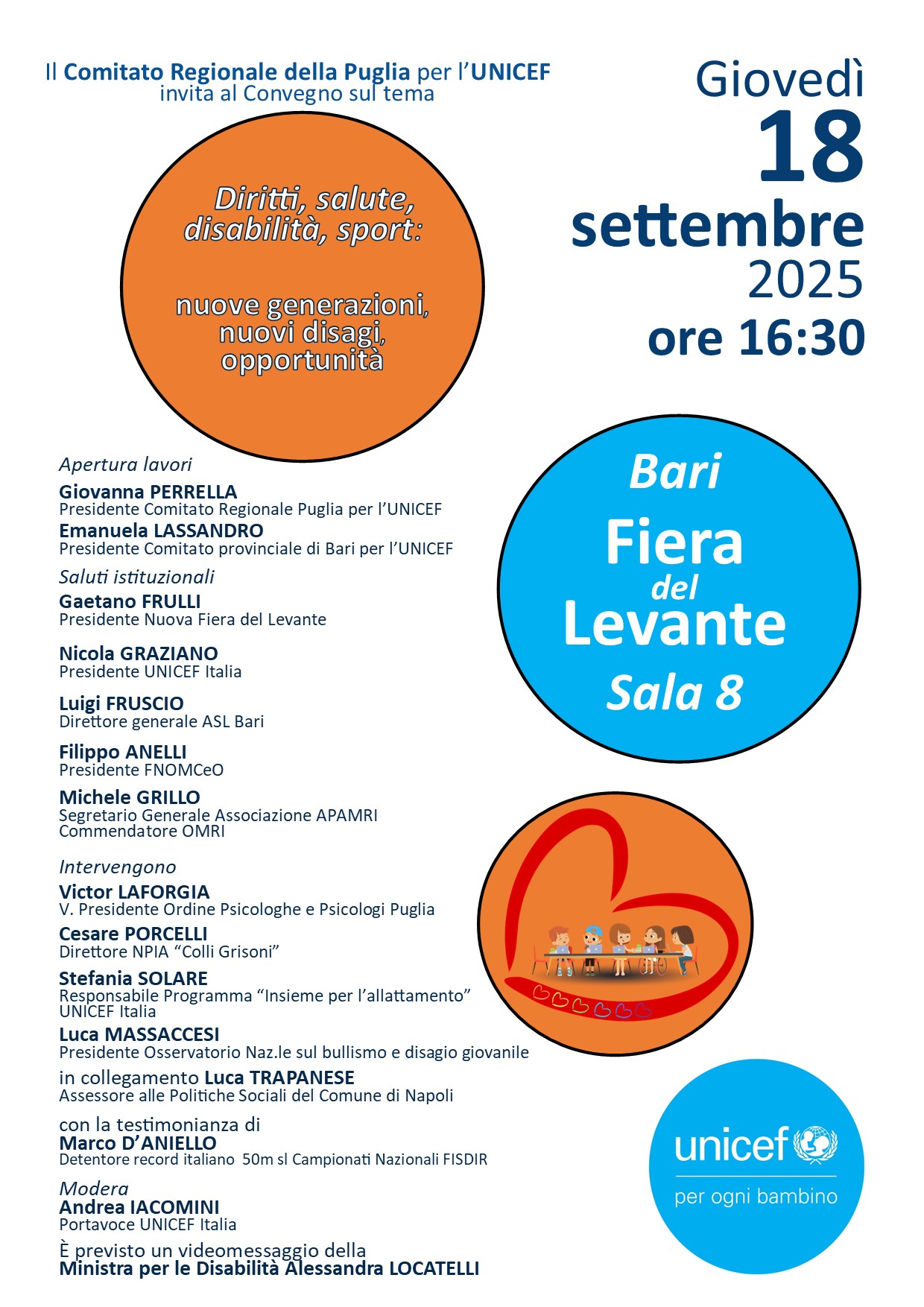 Inoltre, nella giornata di giovedì 18 settembre alle 16:30 nella Sala 8 della Fiera si terrà un interessante incontro sul tema “Diritti, salute, disabilità, sport: nuove generazioni, nuovi disagi, opportunità” organizzato dal Comitato regionale dell’Unicef.