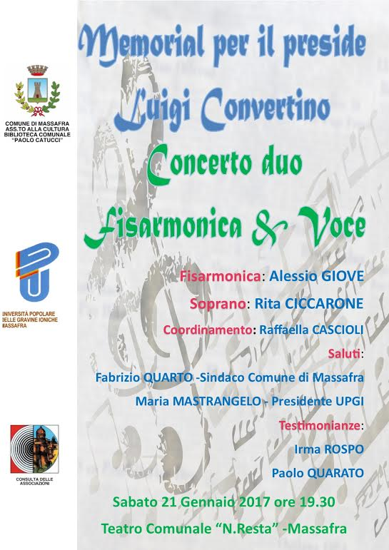 L’Università Popolare delle Gravine Ioniche (UPGI), d’intesa con il Comune di Massafra Assessorato alla Cultura – Biblioteca Comunale “Paolo Catucci” e la Consulta delle Associazioni, organizza il Memorial per il preside Luigi Convertino con un concerto per voce e fisarmonica. La voce sarà quella soprano Rita Ciccarone, alla fisarmonica Alessio Giove.