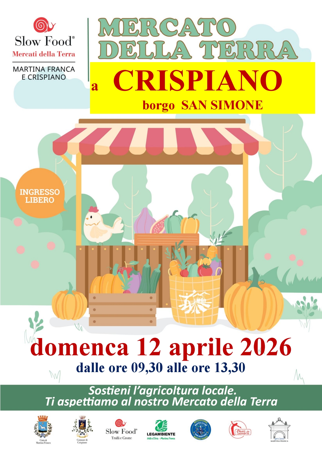Il Mercato della Terra si svolge una volta al mese a Martina e Crispiano in forma alternata. Nei due siti, distanti una ventina di Km, si alterneranno circa 30 produttori.