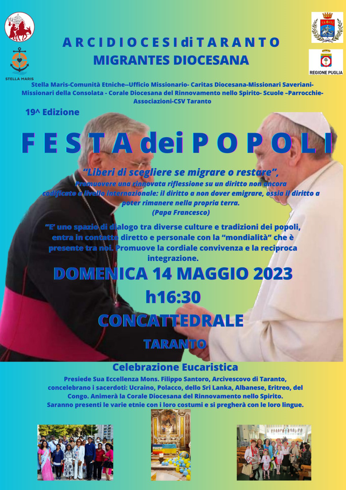 La Festa dei Popoli diocesana 2023 è organizzata dall’Ufficio diocesano Migrantes di Taranto che rappresenta uno spazio di dialogo tra diverse culture e tradizioni dei popoli, entra in contatto diretto e personale con la “mondialità” che è tra noi, promuove la cordiale convivenza e la reciproca integrazione.