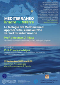 - Si parte questo pomeriggio, lunedì 22 settembre, alle 16:00 preso l’Auditorium dell’Arcivescovado di Taranto in P.zza Arcivescovado 8, con l’incontro che vedrà protagonista il Prof. Don Vincenzo Di Pilato, teologo della facoltà pugliese, che parlerà del cammino del Manifesto di Marsiglia: per una teologia dal Mediterraneo a cui il Centro di Cultura ha aderito sin dalla sua prima elaborazione e pubblicazione (settembre 2023).