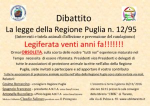 Sarà l’occasione di dibattito, confronto reciproco e condivisione di una proposta di modifica della legge regionale n.12/95 in materia di randagismo, ormai obsoleta ed insufficiente, da consegnare formalmente nelle mani del consigliere regionale Cosimo Boccacino, consigliere della Regione Puglia, sensibile al benessere degli animali per la conseguente discussione nelle sedi opportune.