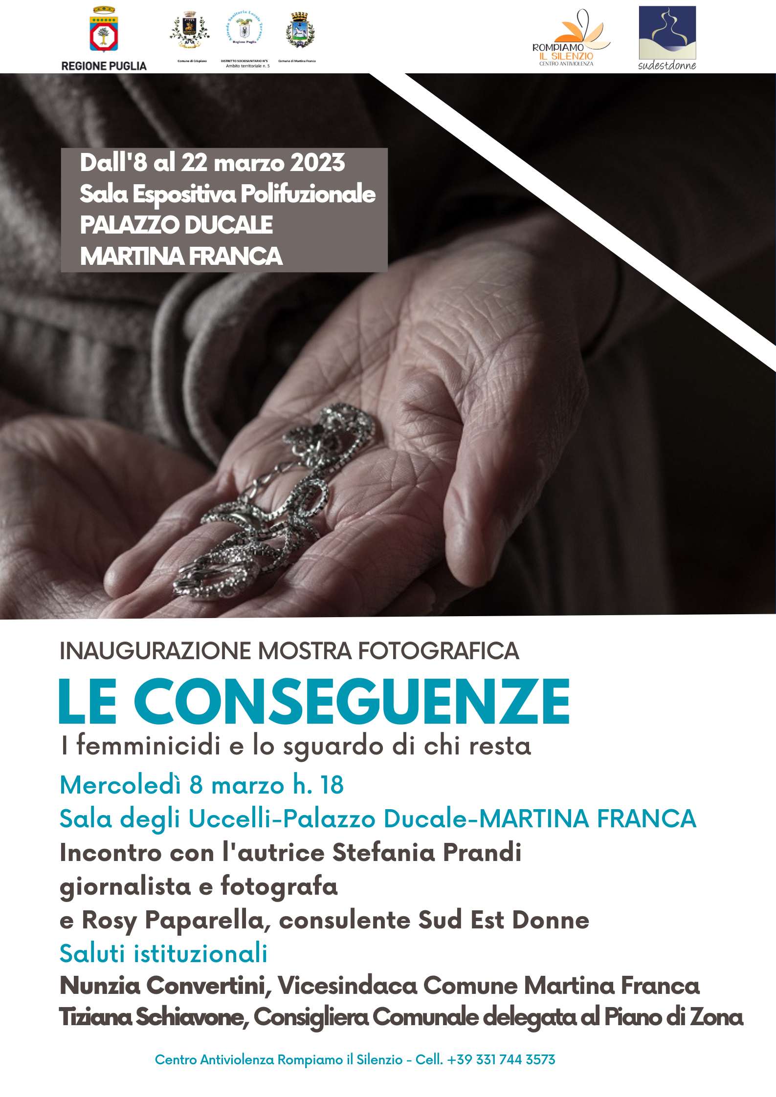 Le conseguenze: i femminicidi e lo sguardo di chi resta. Questo il titolo della mostra fotografica che il Centro Antiviolenza Rompiamo il Silenzio, in collaborazione con l’Ambito Territoriale di Martina Franca e il sostegno della Regione Puglia, promuove in occasione dell’8 marzo, la Giornata internazionale per i diritti delle donne.