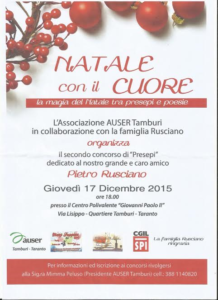 Si tratta di un concorso di presepi dedicato ad un volontario dell’associazione, Pietro Rusciano.