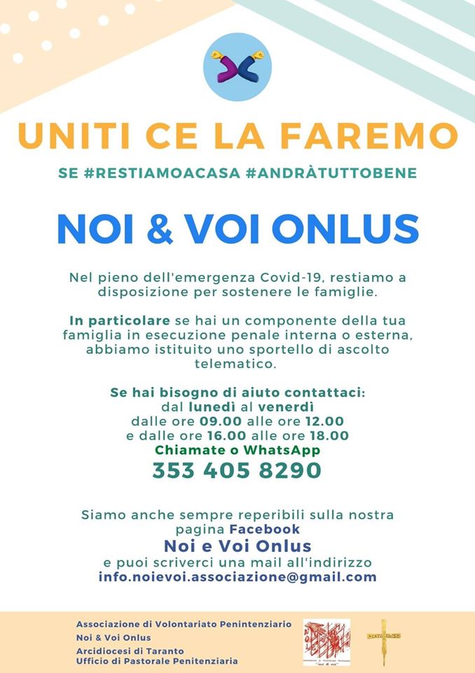L’Associazione Noi e Voi è una delle realtà associative tarantine che sta collaborando con il Segretariato Sociale e la Protezione Civile per la consegna dei farmaci e della spesa a domicilio per persone fragili. Per l’acquisto dei beni da acquistare e consegnare a domicilio è stato firmato un protocollo d’intesa con la Coop. Chiunque abbia necessità o dovesse conoscere qualcuno che ha bisogno di usufruire del servizio, può contattare i volontari dell’associazione ai seguenti recapiti: