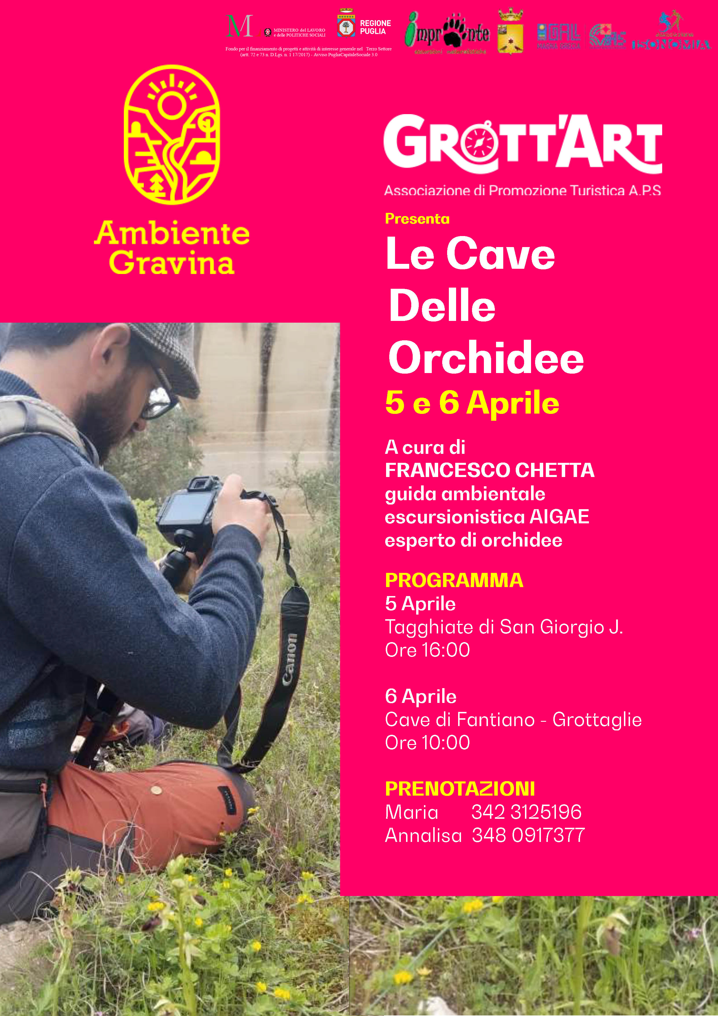Da qui la scelta di di Grott’Art di realizzare due escursioni, la prima di San Giorgio Ionico nelle Tagghiate e la seconda di Grottaglie con un percorso che va dalla Gravina del Fullonese alle Cave di Fantiano,, siti che presentano ecosistemi diversi e, conseguentemente, anche differenti specie di orchidee selvatiche, è comunque possibile partecipare ad entrambe le iniziative.