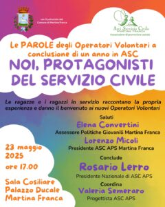 L’Arci Servizio Civile Martina Franca Aps, con il patrocinio del Comune di Martina Franca, organizza per venerdì 23 maggio, con inizio alle ore 17:00 presso la Sala Consiliare del Palazzo Ducale, un incontro di presentazione del Servizio Civile Universale per i volontari selezionati del nuovo bando (118 in tutto per 9 progetti) che inizieranno la loro esperienza il 28 maggio 2025.