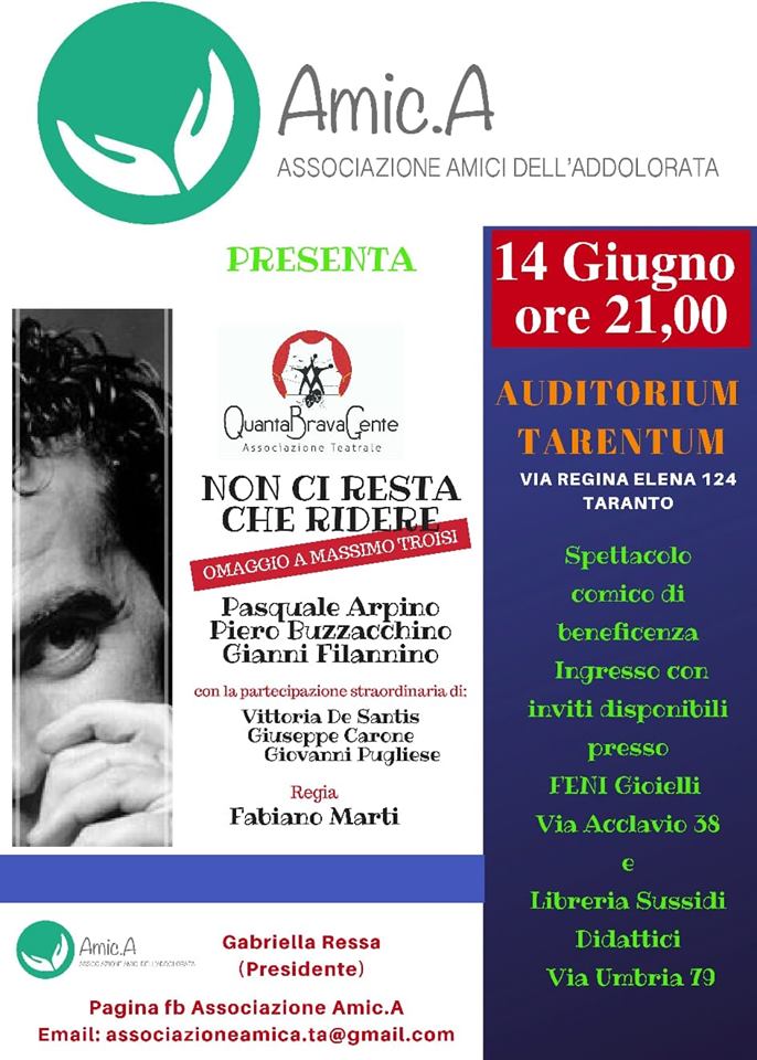 Lo spettacolo Non ci resta che ridere …..omaggio a Troisi sarà portato in scena all’Auditorium Tarentum alle ore 21:00 (ingresso ore 20.30) dalla Compagnia Quanta Brava Gente.