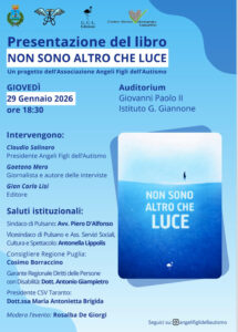 E’ una iniziativa dell’Associazione Angeli Figli dell’Autismo ODV la presentazione del libro dal titolo Non siamo altro che luce che si terrà giovedì 29 gennaio alle 18:30 presso l’Auditorium Giovanni Paolo II dell’Istituto G. Giannone di Pulsano.
