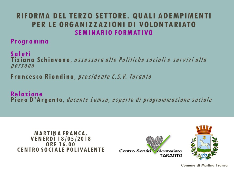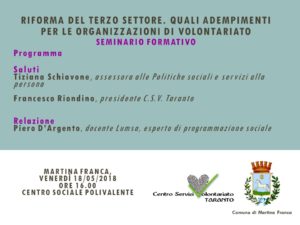 Continua il ciclo di  seminari di approfondimento sulla Riforma del Terzo settore. Il prossimo incontro si terrà a Martina Franca venerdì 18 maggio, dalle 16.00 alle 19.00 c/o il Centro Sociale Polivalente in Via Carmine.