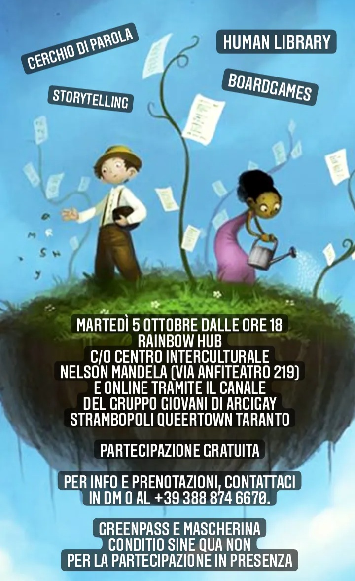 Lə ARTivistə del Gruppo Giovani di Arcigay Strambopoli QueerTown Taranto, della Hermes Academy e del Coordinamento Taranto Pride organizzano per il pomeriggio di martedì 5 ottobre alle ore 18:00 un incontro presso il Rainbow Hub, negli spazi del Centro Interculturale Nelson Mandela, in Via Anfiteatro 219.