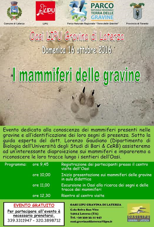 Nell’ambito del programma Eventi-Natura 2016 dell’Oasi LIPU Gravina di Laterza domenica 16 ottobre, alle ore 9.45, si terrà l’evento I mammiferi delle gravine.