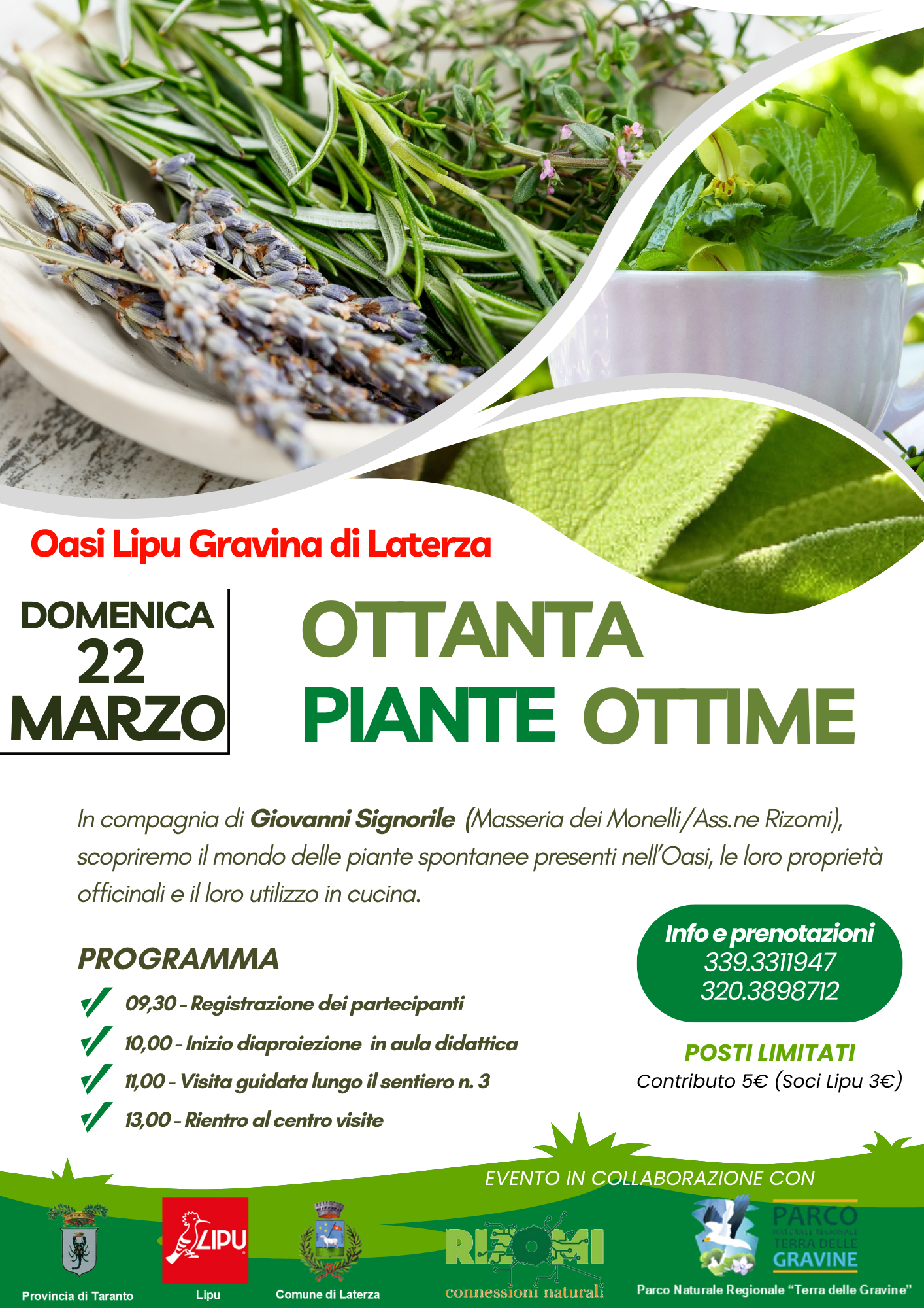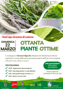 Nell’ambito del programma Eventi-Natura 2026 dell’Oasi Lipu Gravina di Laterza domenica 22 marzo alle 09,30, si terrà l’evento “Ottanta Piante Ottime”; nello splendido scenario dell’Oasi Lipu Gravina di Laterza un interessante appuntamento per chi vuole approfondire le proprie conoscenze sul mondo delle piante spontanee eduli e officinali presenti nel nostro territorio.