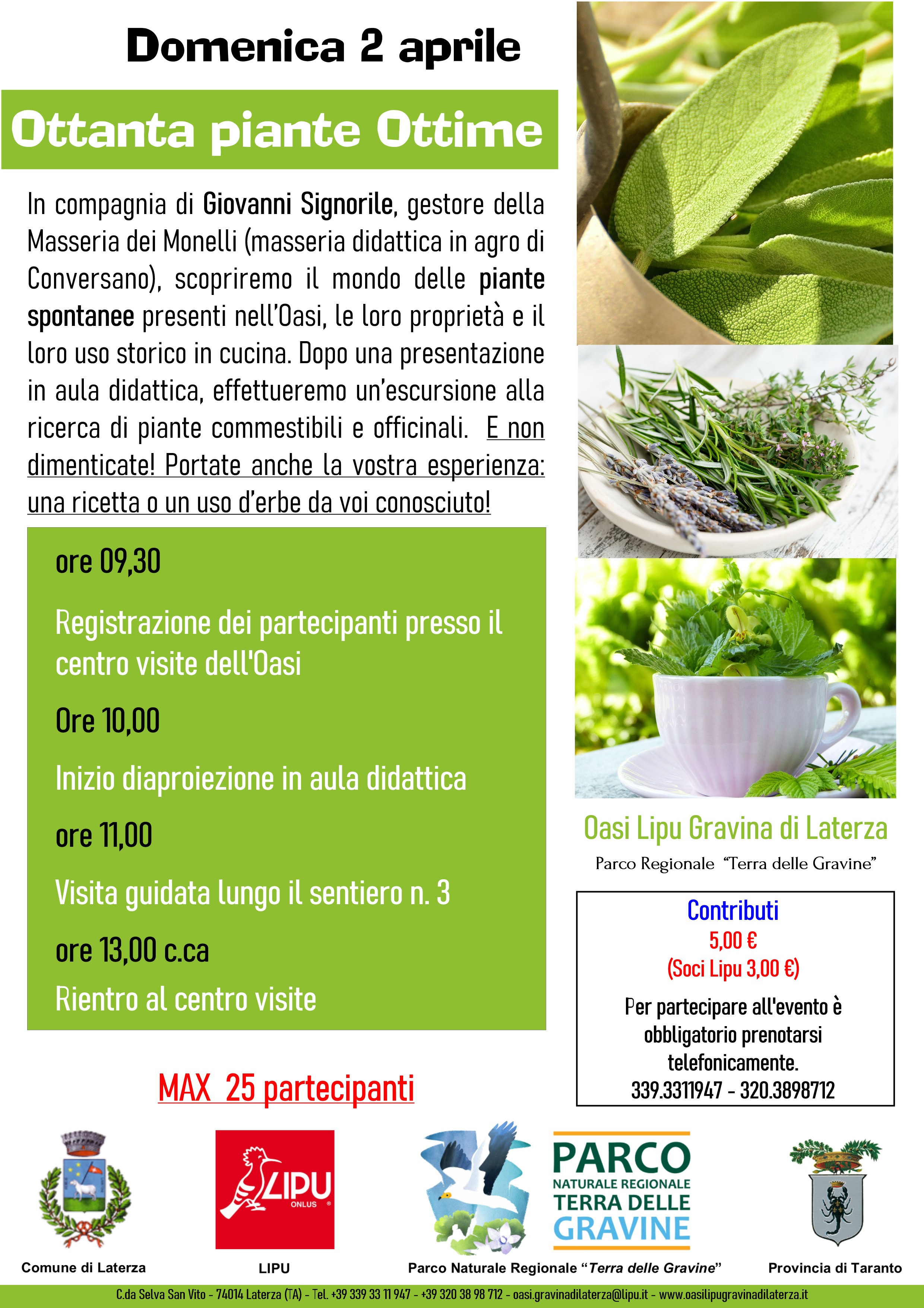 Nell’ambito del programma Eventi-Natura 2023 dell’Oasi LIPU Gravina di Laterza domenica 2 aprile alle 10:00, si terrà l’evento Ottanta piante ottime.
