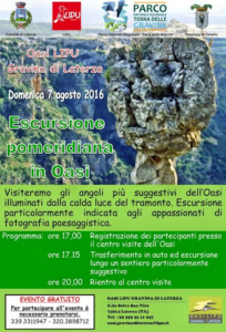 Dopo l’evento di sabato 30 luglio, La notte delle stelle, il programma Eventi-Natura 2016 dell’Oasi LIPU Gravina di Laterza propone agli amanti della natura un secondo appuntamento, Escursione pomeridiana in Oasi, previsto per domenica 7 agosto, alle ore 17.00.