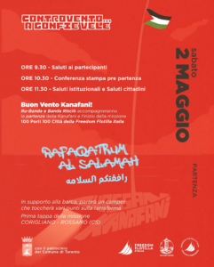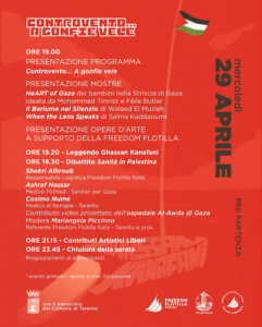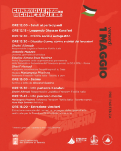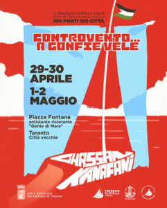 Dal 29 aprile al 2 maggio, la città vecchia di Taranto torna luogo di incontro, memoria e impegno civile con Controvento… a gonfie vele: quattro giornate dedicate alla solidarietà con il popolo palestinese e alla partenza della missione Freedom Flotilla Italia, nell’ambito della campagna 100 Porti 100 Città.