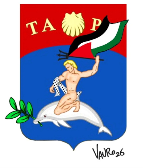 A suggellare simbolicamente questo percorso è la vignetta realizzata da Vauro Senesi, che reinterpreta lo stemma di Taranto intrecciandolo ai simboli della pace e della solidarietà verso la Palestina; un’immagine potente, che lega l’identità della città a una scelta di responsabilità morale e civile.