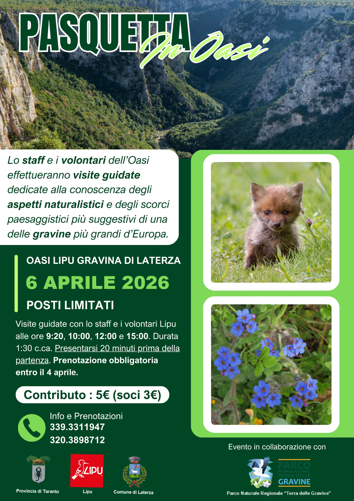 Nell’ambito del programma Eventi-Natura 2026 dell’Oasi Lipu Gravina di Laterza lunedì 6 aprile alle ore 09.00, si terrà l’evento “Pasquetta all’Oasi”. Lo staff e i volontari dell’Oasi effettueranno visite guidate