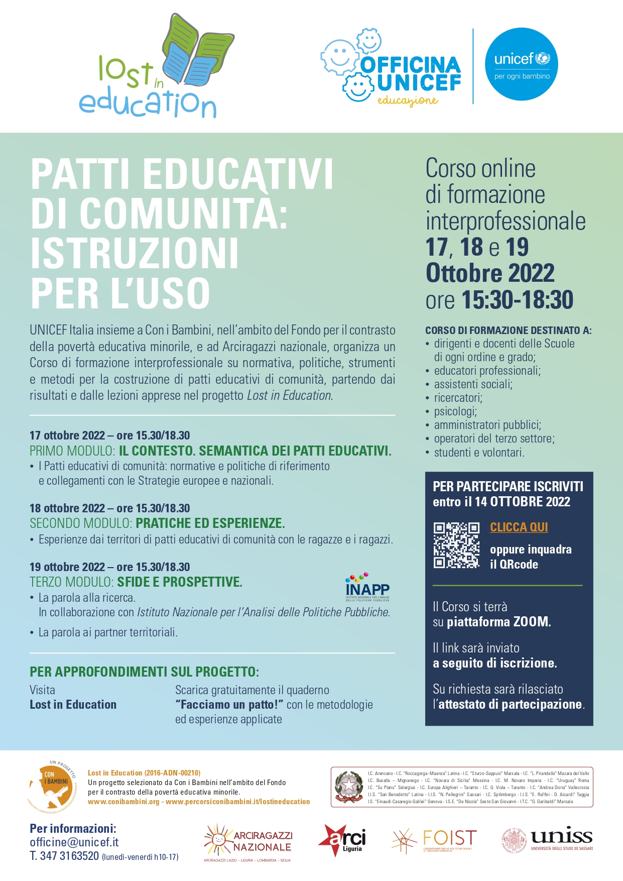 UNICEF Italia insieme a Con i Bambini, nell’ambito del Fondo per il contrasto della povertà educativa minorile, e ad Arciragazzi nazionale, organizza un Corso di formazione interprofessionale su normativa, politiche, strumenti e metodi per la costruzione di patti educativi di comunità, partendo dai risultati e dalle lezioni apprese nel progetto Lost in Education.