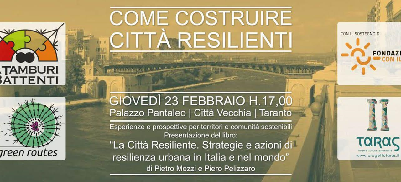 Di resilienza, nonché delle esperienze e delle prospettive per territori e comunità sostenibili, si parlerà a Palazzo Pantaleo, sul corso Vittorio Emanuele II a Taranto, alle ore 17.00 di domani, giovedì 23 febbraio, in occasione della presentazione del libro La Città Resiliente. Strategie e azioni di resilienza urbana in Italia e nel mondo di Pietro Mezzi e Piero Pelizzaro, edito da Altreconomia, pubblicazione che rappresenta un “Manifesto per un nuovo immaginario resiliente”.