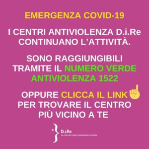 Le operatrici dei centri antiviolenza D.i.Re continuano ad essere a completa disposizione da casa, dal telefono di emergenza, anche via skype – nel rispetto del DCPM sulla prevenzione del contagio – per non lasciare sole le donne che subiscono violenza domestica.