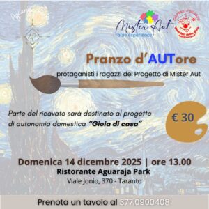 Domenica 14 dicembre alle 13:00 i ragazzi e le ragazze nello spettro autistico, seguiti dall’associazioner Mister Sorriso, accoglieranno gli avventori come addetti alla sala presso il Ristorante Aguaraja Park in Viale Jonio 370 a Taranto.