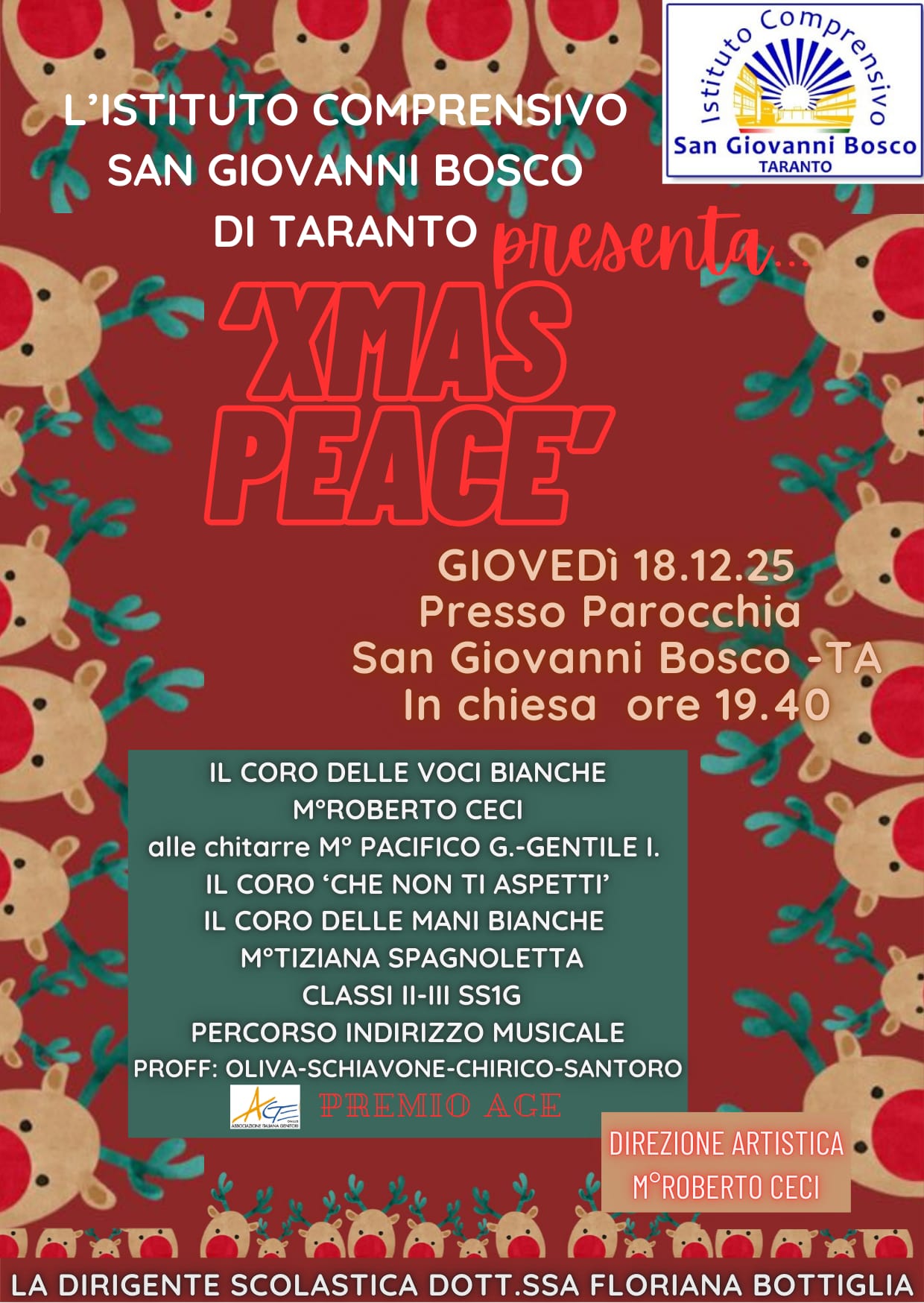 La cerimonia di premiazione, preceduta alle 18.30 dalla celebrazione della Santa Messa, sarà allietata dal Concerto di Natale, Xmas Peace, eseguito dal Coro dell’Istituto Comprensivo “San Giovanni Bosco” diretto diretto dal M° Roberto Ceci.