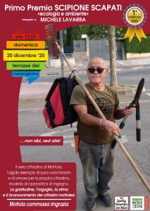 Questo premio, fortemente voluto dal Sig. Gregorio Mongelli e che vede la compartecipazione della ODV Mottola Attiva, quest’anno vedrà premiato il Sig. Michele Lavarra, per il suo costante impegno nella cura del verde pubblico e del decoro urbano, simbolo di cittadinanza attiva.