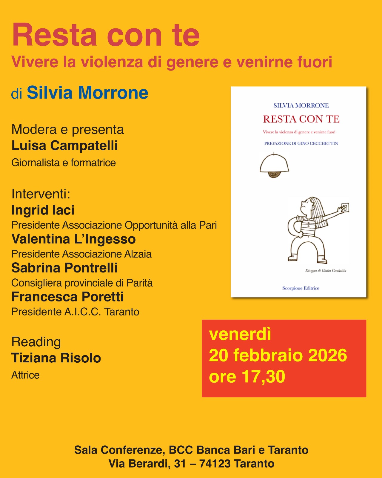 Venerdì 20 febbraio alle ore 17:30 la BCC di Bari e Taranto con sede in via Berardi, 31 ospiterà , la presentazione del libro Resta con te – vivere la violenza di genere e venirne fuori, scritto dalla giornalista e criminologa Silvia Morrone.