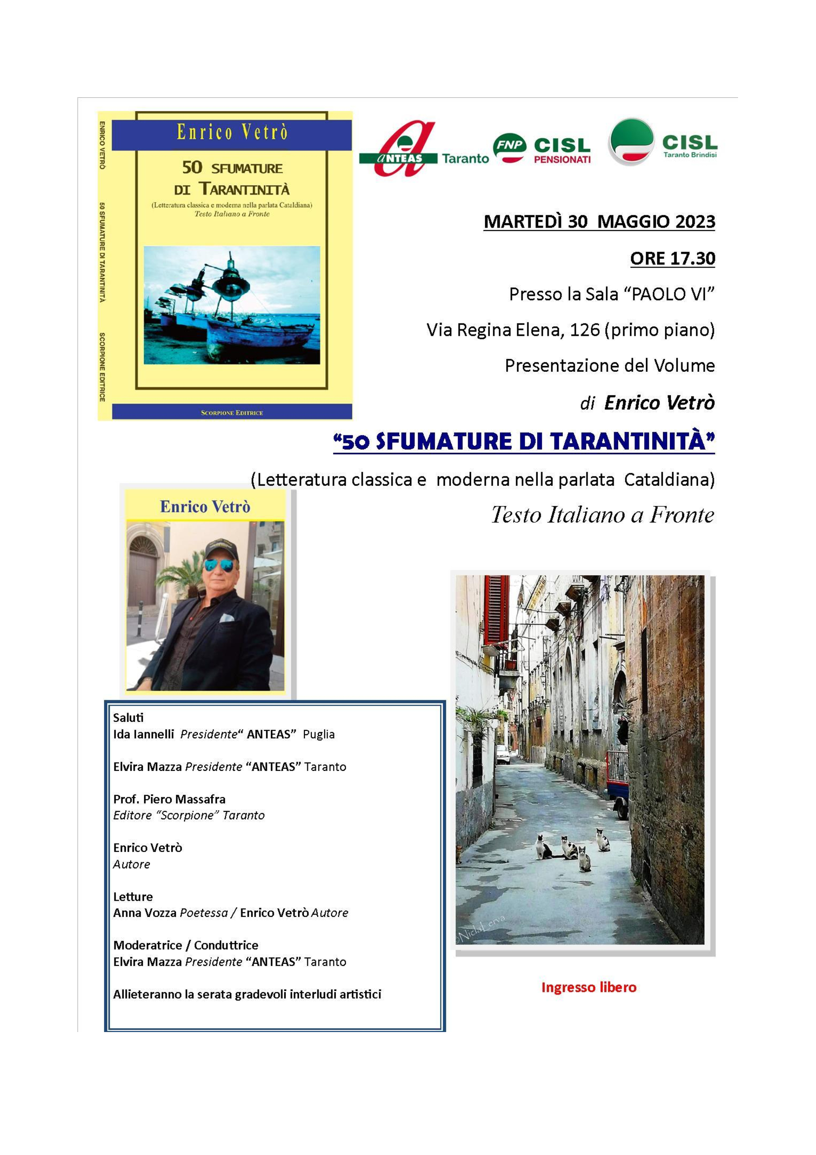 Martedì 30 maggio l’Associazione Anteas di Taranto organizza presso la sala “Paolo VI” in via Regina Elena, 126 (primo piano), la presentazione del libro di Enrico Vetrò: 50 SFUMATURE DI TARANTINITÀ, frutto di ricerca e di studi pluriennali del dialetto della nostra “Piccola Patria” così ricca di storia e tradizioni.