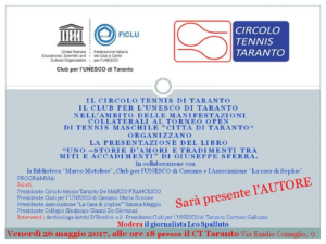 Nell’ambito delle manifestazioni collaterali al Torneo Open di Tennis Maschile “Città di Taranto”, il Circolo Tennis di Taranto e il Club per l’UNESCO di Taranto, in collaborazione con la Biblioteca “Marco Motolese”, Club per l’UNESCO di Cassano e l’Associazione “La casa di Sophie”, organizzano per venerdì 26 maggio alle ore 18:00 presso il CT Taranto Via Emilio Consiglio, 9 Taranto la presentazione del libro Uno–Storie d’amori e tradimenti tra miti e accadimenti di Giuseppe Sferra.