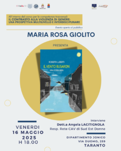Venerdì 16 maggio alle ore 18.00, nell’Aula 3 del Dipartimento Jonico di TARANTO in via Duomo, 259 si terrà la presentazione del libro Il Vento Busaron. Una storia vera, libro postumo di Roberta Luberti, tassello importante di una grandissima eredità scientifica, di ricerca, formazione e azione per i diritti dei bambini, delle donne e degli adulti sopravvissuti alla violenza nell’infanzia.