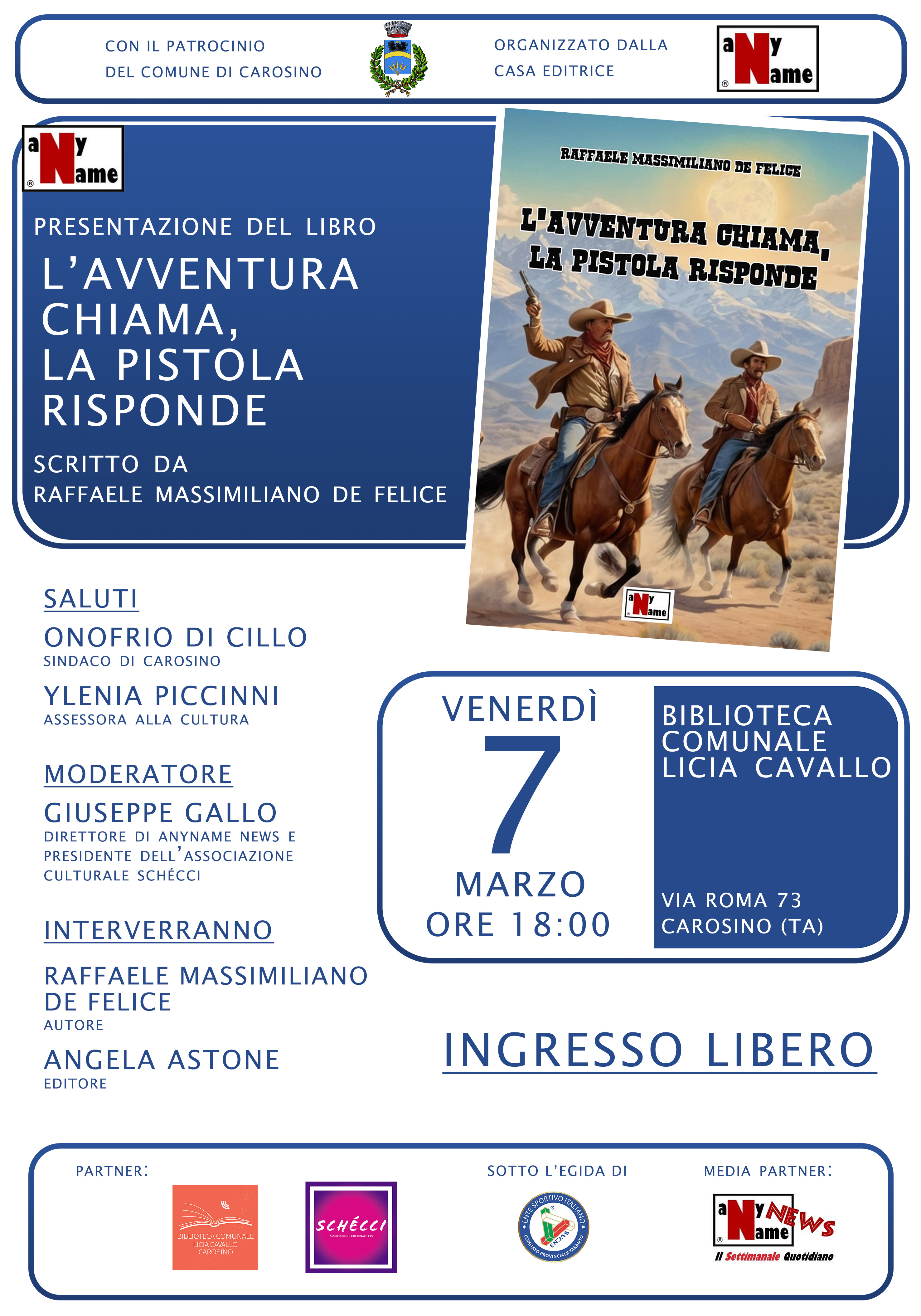Venerdì 7 marzo alle ore 18:00, presso la Biblioteca Comunale “Licia Cavallo” di Carosino, si terrà la presentazione del libro L’avventura chiama, la pistola risponde (AnyName Edizioni): un’antologia di racconti western realizzata dall’autore Raffaele Massimiliano De Felice.