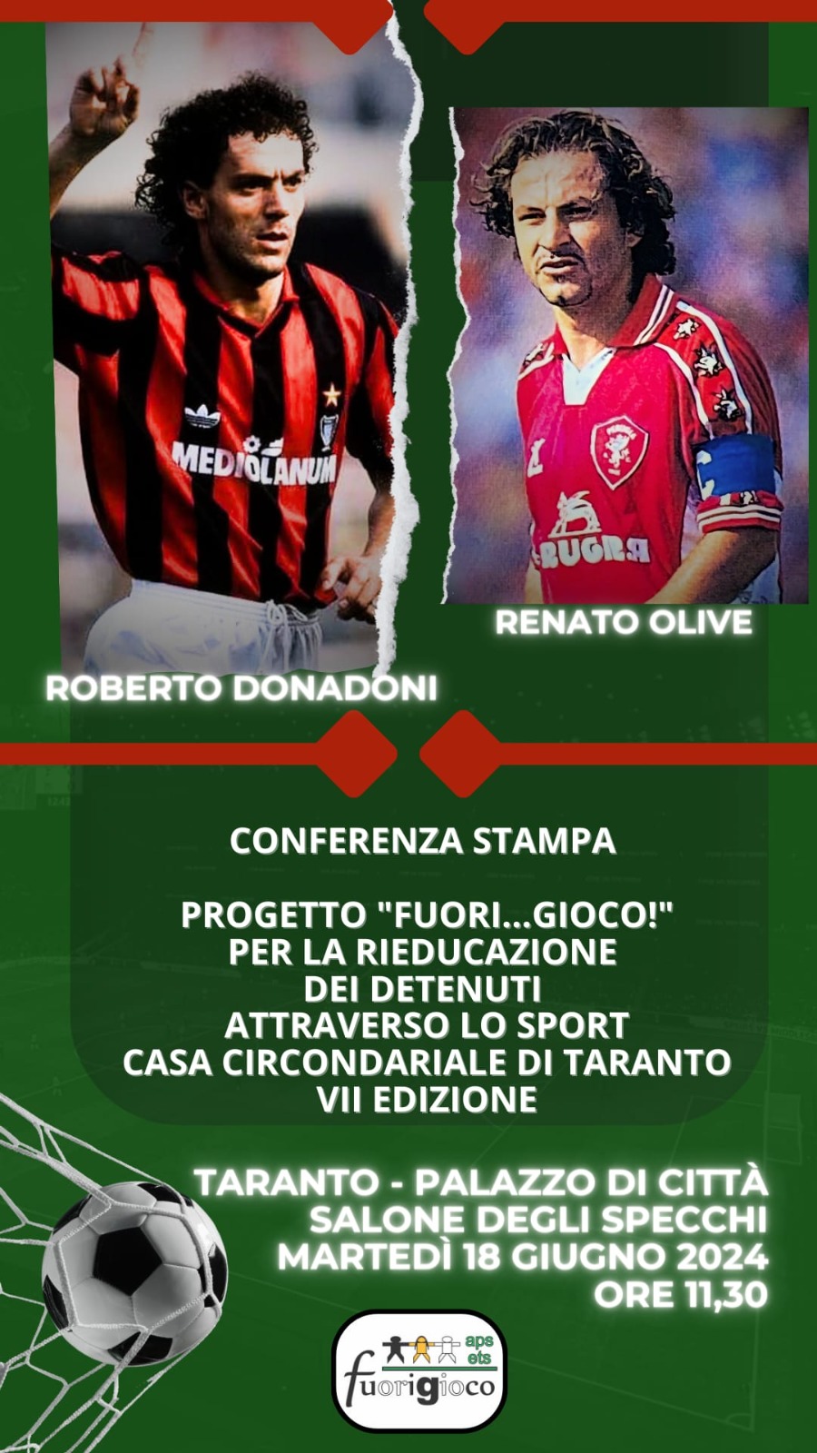 Sarà presentato nel corso della conferenza stampa che si terrà martedì 18 giugno alle 11:30 nel Salone degli Specchi – Palazzo di Città di Taranto, l’evento finale del Progetto Fuori…gioco! VII Edizione dell’APS “Fuorigioco” per la rieducazione dei detenuti attraverso lo sport.